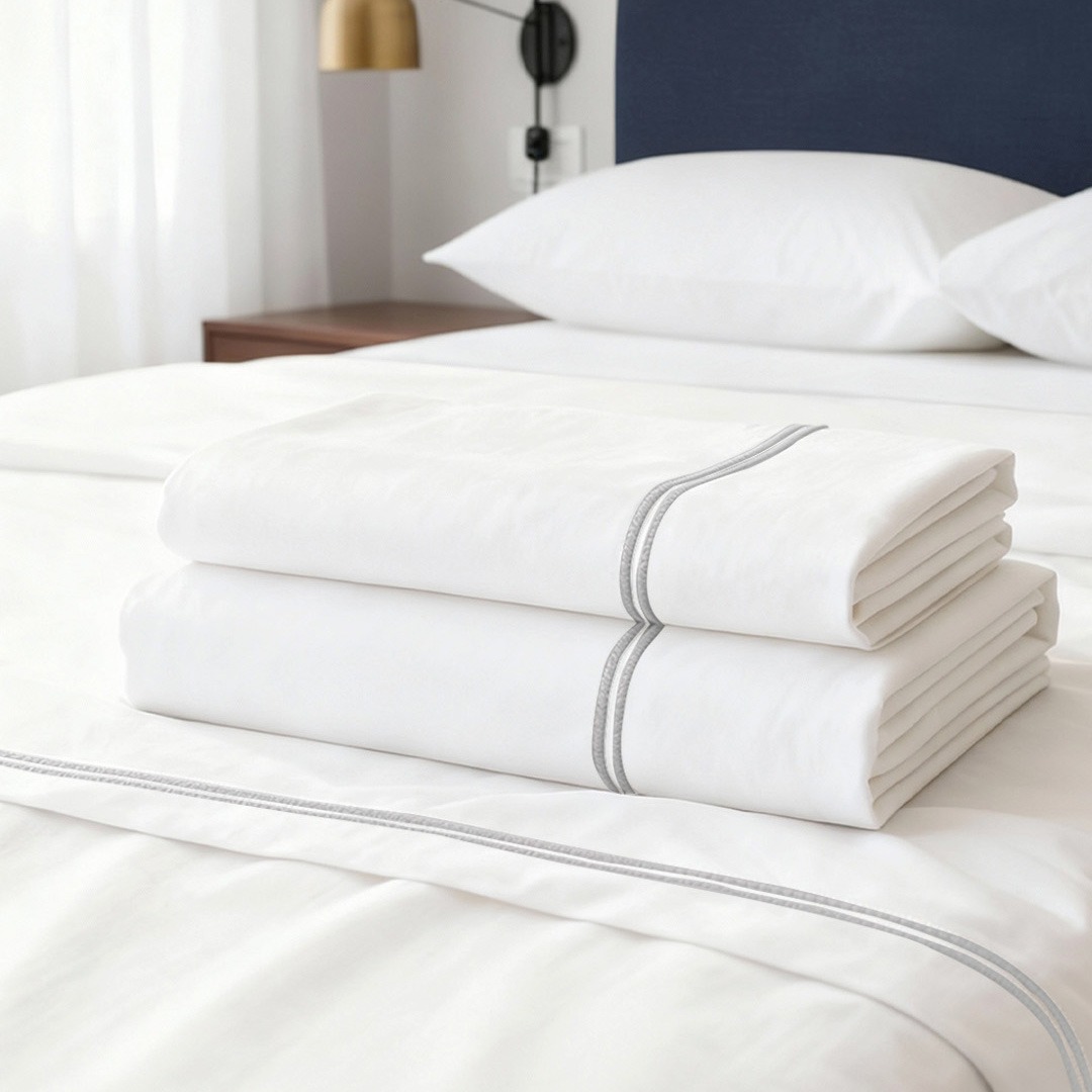 SET SABANAS 400 HILOS ALGODON EGIPCIO COLOR BLANCO RIBETE BORDADO GRIS