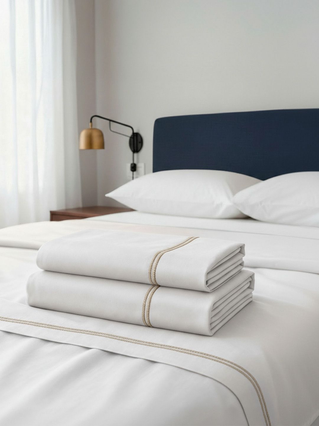 SET SABANAS 400 HILOS ALGODON EGIPCIO COLOR BLANCO RIBETE BORDADO TAUPE